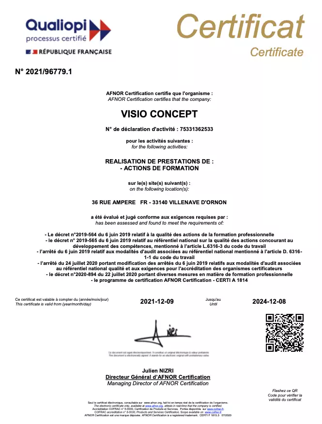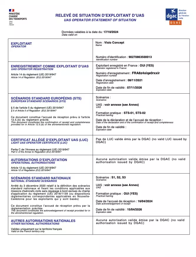 Au cœur de l’innovation technologique et de la formation professionnelle, Visio Concept Formations est le centre de référence en Gironde pour l’apprentissage et l’excellence dans le domaine du télépilotage de drones. Notre mission : former des professionnels hautement qualifiés, capables d’intervenir dans les secteurs de la photogrammétrie, de la thermographie, de l’inspection et des applications aériennes avancées. Depuis nos sites de Bordeaux, Villenave-d’Ornon, Langon, Saint-Pierre-d’Aurillac, Caen, Rouen, Paris... nous offrons un parcours complet, conforme aux scénarios européens STS01 (vol à vue) et STS02 (vol hors vue) et agréé par la DGAC.